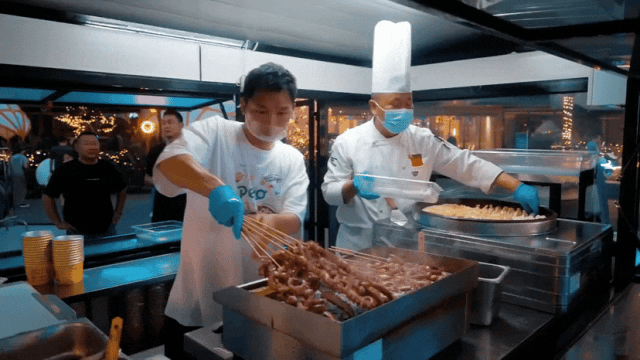 在夜市兩旁,章魚燒、特色酥肉、撈汁小海鮮、小龍蝦……十余家風(fēng)味小吃店一字排開,琳瑯滿目,吸引了不少消費(fèi)者駐足品嘗。