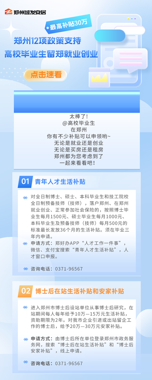 近年來,鄭州市通過盤活存量房源用作人才公寓、發(fā)放購房租房補貼等形式,多渠道解決人才階段性居住需求。比如,鄭州市創(chuàng)新實施人才補貼,除了人才公寓以外,符合條件的博士、碩士、學士學位畢業(yè)生,5年內分別可享每月3000元、1500元、1000元房租補助,購房給予10萬元到30萬元不等的一次性購房補貼。