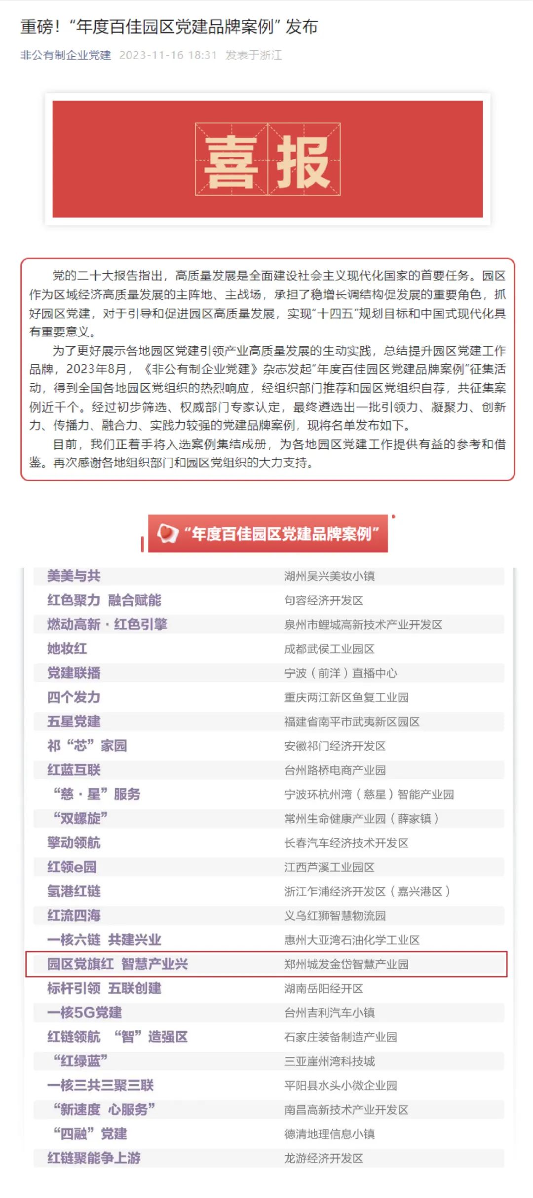 11月16日,由《非公有制企業(yè)黨建》雜志發(fā)起的“年度百佳園區(qū)黨建品牌案例”征集活動遴選結(jié)果揭曉。鄭州城發(fā)集團(tuán)“園區(qū)黨旗紅 智慧產(chǎn)業(yè)興”基層黨建“書記項目”從近千個入圍案例中脫穎而出,成功入選“年度百佳園區(qū)黨建品牌案例”。