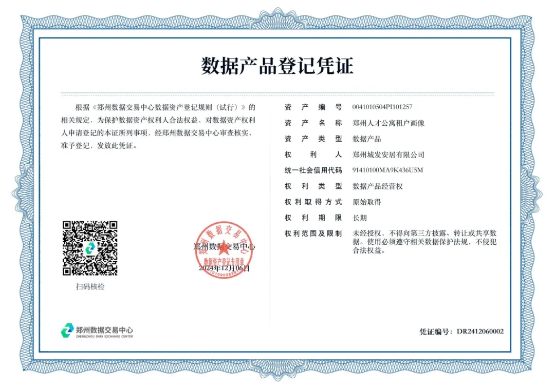 12月6日,鄭州城市發(fā)展集團有限公司下屬子公司鄭州城發(fā)安居有限公司(以下簡稱“城發(fā)安居”)在鄭州數(shù)據(jù)交易中心成功完成了“鄭州人才公寓租戶畫像”的資產登記,正式取得數(shù)據(jù)產品登記憑證,成為鄭州首例將人才公寓運營數(shù)據(jù)資產入表的市屬國企。