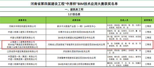 近日,由河南省住建廳指導(dǎo)、河南省建筑業(yè)協(xié)會主辦的河南省第四屆建設(shè)工程“中原杯”BIM技術(shù)應(yīng)用大賽獲獎名單揭曉,經(jīng)過層層評審,由鄭州地產(chǎn)集團(tuán)投資管理有限公司主導(dǎo),上海建工二建集團(tuán)有限公司、機(jī)械工業(yè)第六設(shè)計研究院有限公司配合完成申報的河南省人民醫(yī)院地下智能停車及綜合開發(fā)建設(shè)項目BIM技術(shù)應(yīng)用榮獲建筑類綜合成果三等獎。